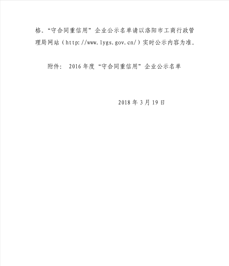 近期在洛阳市工商行政管理局公示的“2016年守合同重信用企业”名单中,我公司名列其中,同时还获得了省守重企业称号。